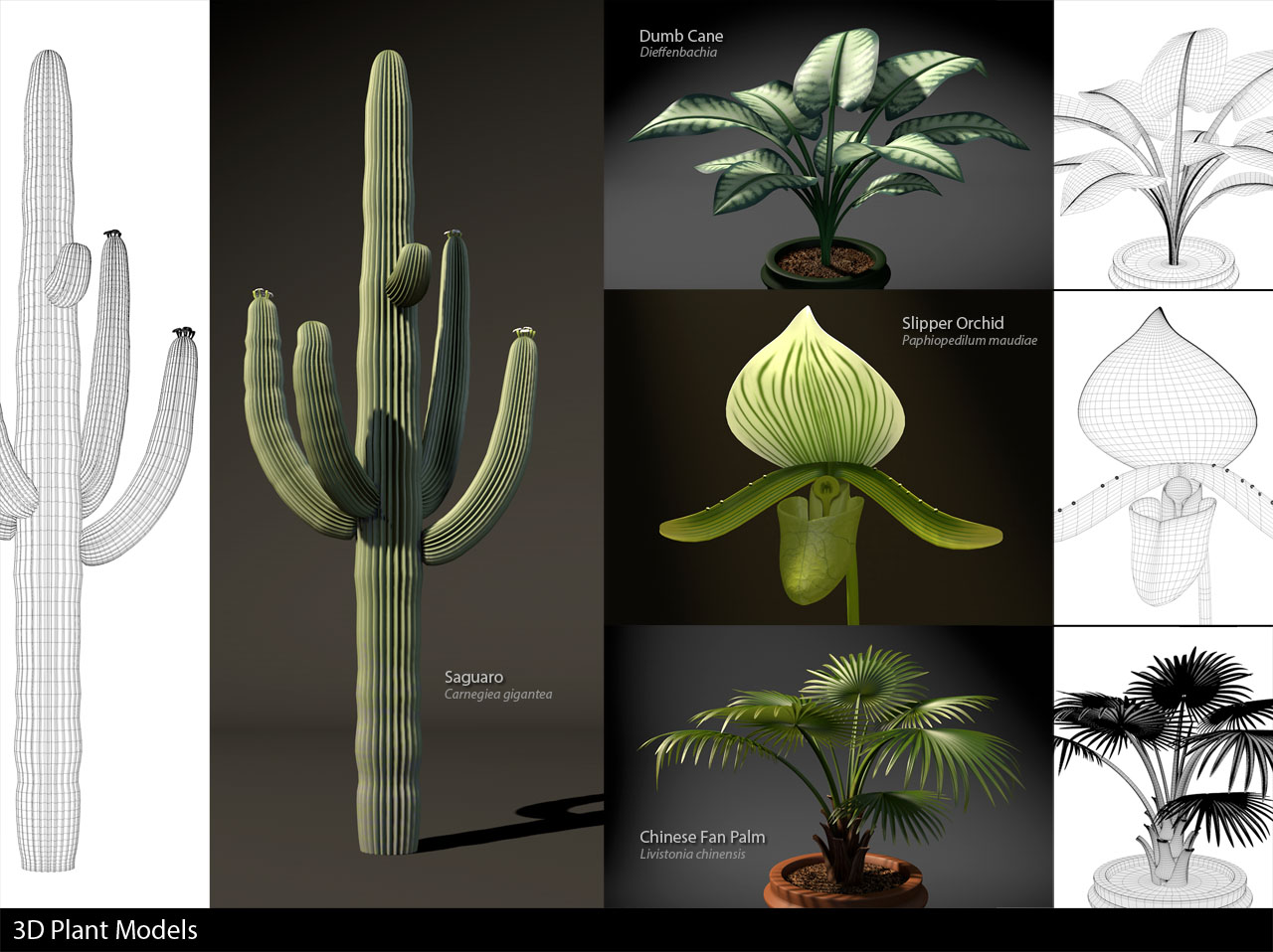 Various 3D models of plants, showing wireframes.